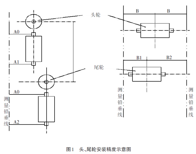 提升機全部安裝完畢后,頭、尾輪軸水平度允差≤0.3/1000,同時應(yīng)符合圖1和表2的規(guī)定。