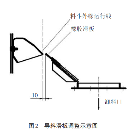 為控制物料回流,在提升機頭部出料口設(shè)置了一個可調(diào)節(jié)的橡膠滑板,在料斗安裝完后,調(diào)整橡膠滑板外緣使它與料斗外緣運行線之間的距離為10mm,將其緊固(見圖2)。