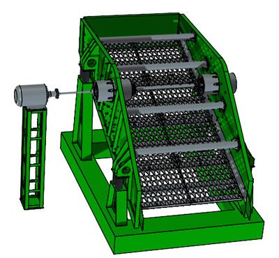 單軸振動篩有一個(gè)十分牢靠的篩箱,因?yàn)槠浣Y(jié)構(gòu)是焊接及鉚接而成,在振動器的主軸上不僅中間位置有偏心軸,而且主軸兩頭也有能夠調(diào)節(jié)的偏心輪。在篩分時(shí),電動機(jī)經(jīng)由三角帶作用于振動器,傳動軸使偏心軸及偏心輪產(chǎn)生慣性力,這種慣性力會令篩箱作近似的圓形的運(yùn)動,使物料得到了佳的篩分效果。